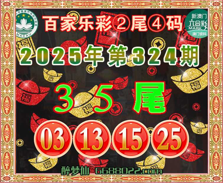 324期:『百家乐彩』 🧩②尾④码🧩【35尾主:03.13.15.25】开:15准