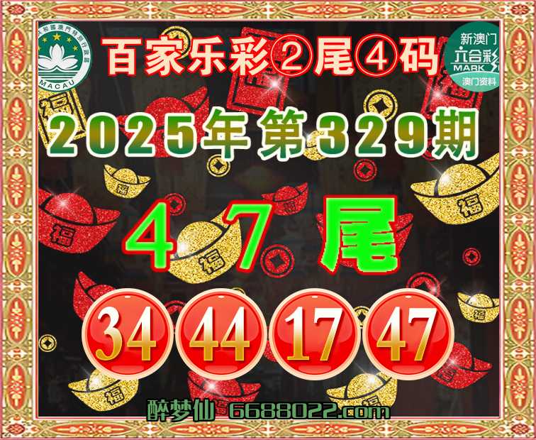 329期:『百家乐彩』 🧩②尾④码🧩【47尾主:34.44.17.47】开:17准