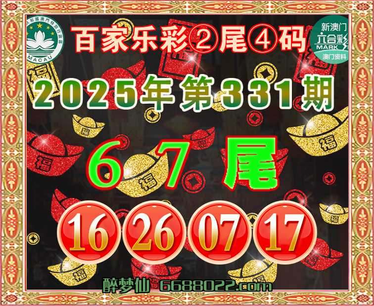 331期:『百家乐彩』 🧩②尾④码🧩【67尾主:16.26.07.17】开:26准