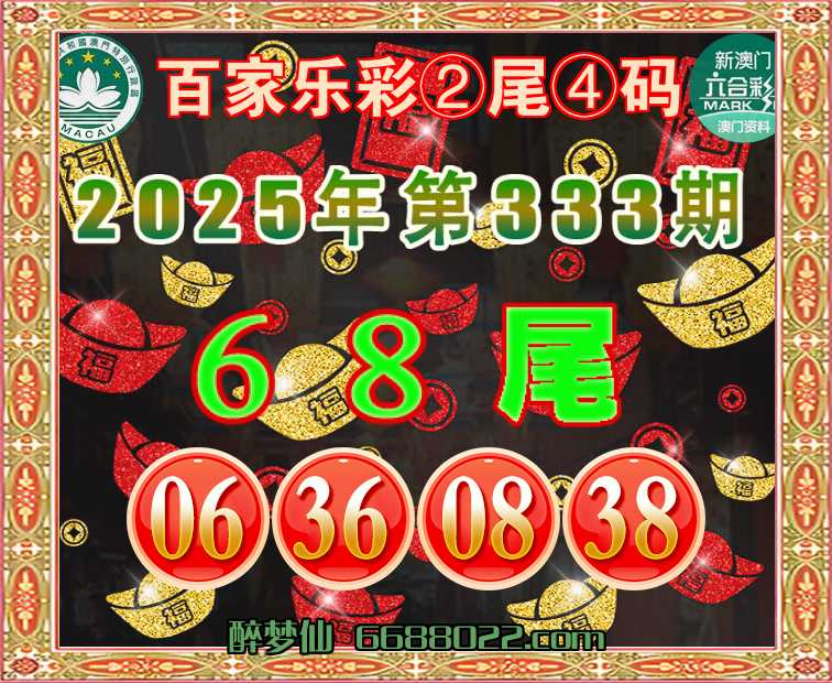 333期:『百家乐彩』 🧩②尾④码🧩【68尾主:06.36.08.38】开:06准