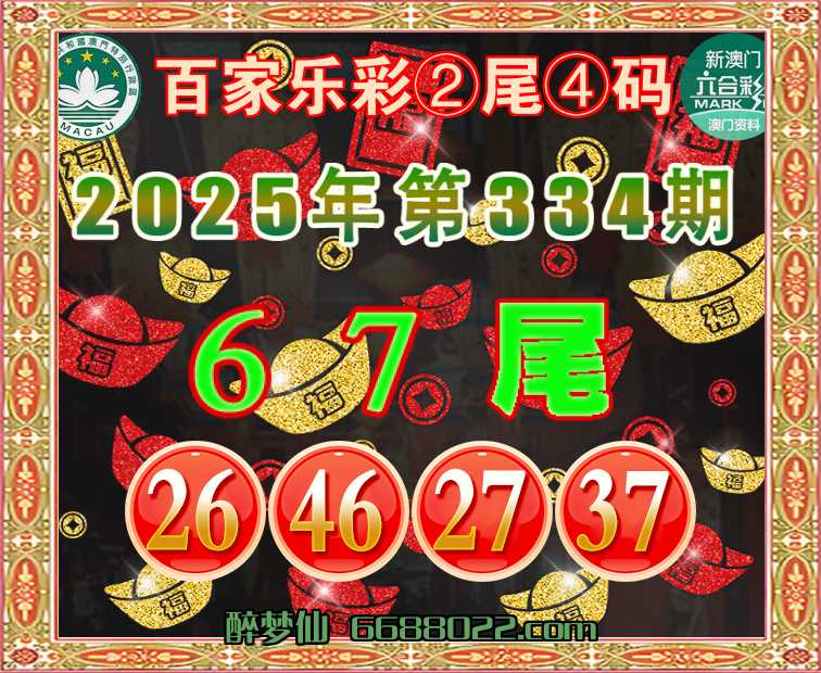 334期:『百家乐彩』 🧩②尾④码🧩【67尾主:26.46.27.37】开:46准