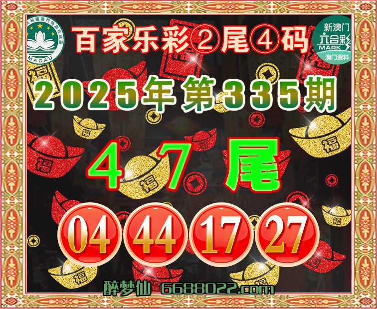 335期:『百家乐彩』 🧩②尾④码🧩【47尾主:04.44.17.27】开:44准