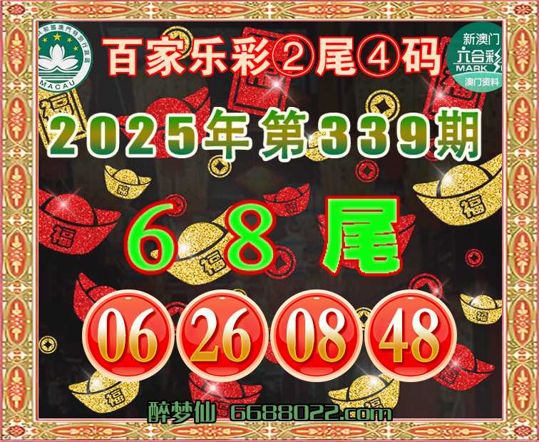 339期:『百家乐彩』 🧩②尾④码🧩【68尾主:06.26.08.48】开:48准